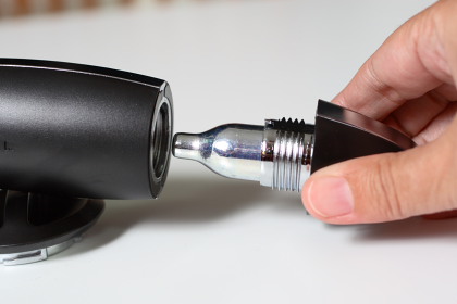 The works - Dig this. The MyPressi twist is powered, by all things, Nitrous oxide cartridges... you know, those teeny little mini-scuba tanks that power whipped cream dispensers. It is a great idea because these little cartridges actually provide more than enough bar pressure (brew pressure for espresso = 9 Bar) to brew a shot of espresso. The cartridges are cheap enough - about 6 bucks for a box of 10 and you can get about 4 - 5 brews out of each one - and the steel cylinders are fully recyclable.