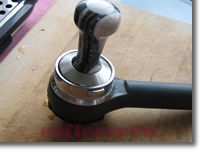 Okay, so you have ground your coffee or had someone grind it to spec for you. I will not go into the issues of ground coffee here. I will assume that it has been ground appropriately for your machine. Spoon the espresso coffee into the portafilter as shown in the photo above left. Before you tamp it down, it should be more or less level with the top of the coffee portafilter. You can tamp it with a variety of gidgets or gadgets. I like the hand-made Reg Barber tamper, but whether this unit is right for you is beyond this basic discussion. Use the device that comes with the unit and if you do not have one, us the bottom of a shot glass or some suitably flat surface.